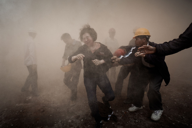 2012年3月21日,广州杨箕村二度拆迁开始。中午12时15分,在对永巩二横巷8号的李洁娥家进行拆除时,永巩二横7号黄素芳的住楼被不慎挖倒一半。黄素芳情绪激动,欲冲入自己的住楼,但被施工方拦住,并发生肢体冲突。原来在此次拆迁规划中,黄素芳的房子并没有在其中。见到自己房子被拆,黄素芳情绪激动,在与施工方的拉扯中,发生激烈的肢体冲突。(第三届中国新闻摄影年赛战争、灾难类新闻单幅优秀奖)