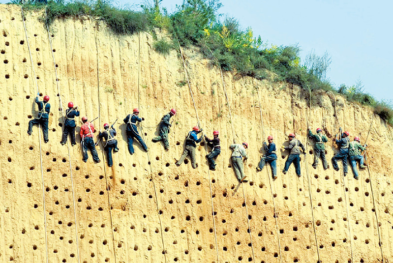 10月25日,太原市西山城郊森林公园,工人们像“蜘蛛人”一样吊在80多米高的边坡上栽种树苗。太原市将西山地区作为转型发展的示范区,将西山城郊森林公园作为综改试验区的标杆项目,各建设主体在绿化方面大力投入,把生态绿化与治理区域污染、地质灾害结合起来,峭壁绿化是一项主要而艰巨的工程。(第三届中国新闻摄影年赛新闻人物与肖像单幅铜奖)