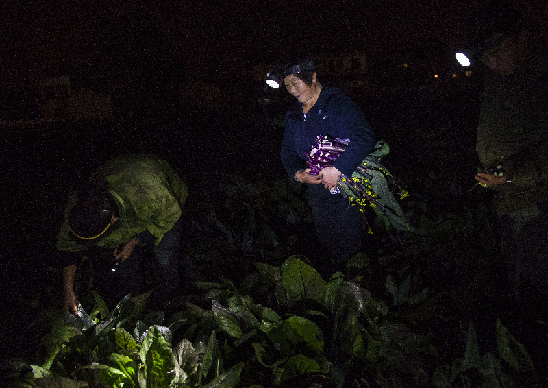 每天深夜,菜农们就打头灯在地里摘菜,为进城卖菜作准备。