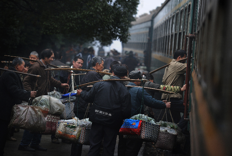 菜农们挑着沉重的担子,奔向还没停稳的绿皮火车。