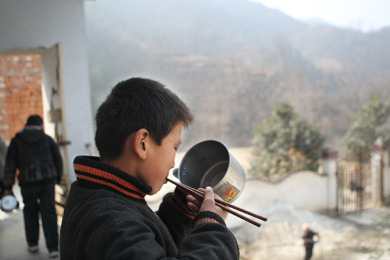 袁明阳吃得直打饱嗝,可最后他饭缸里一粒米没剩,说不能浪费。