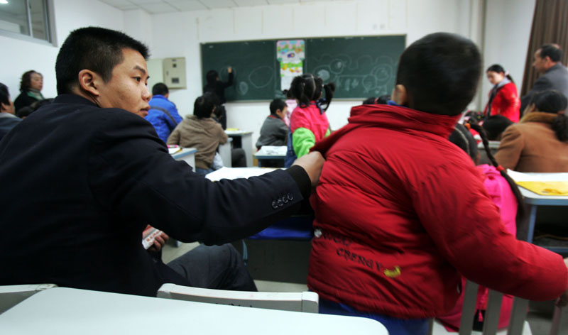 2007年12月1日,在武汉一家培训中心,一位家长攥住刚准备逃课的儿子。
