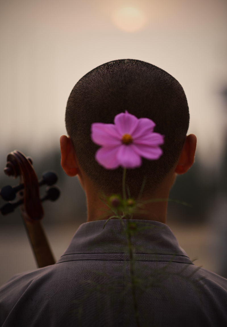 2012年10月10日,在湖北省红安县天台寺,23岁的尼姑释正孝同抱着小提琴的背影。