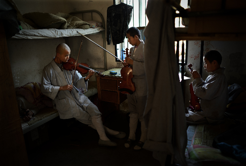 2012年10月2日,在湖北省红安县天台寺,几个小和尚在竂房里练习拉小提琴,切磋技艺。
