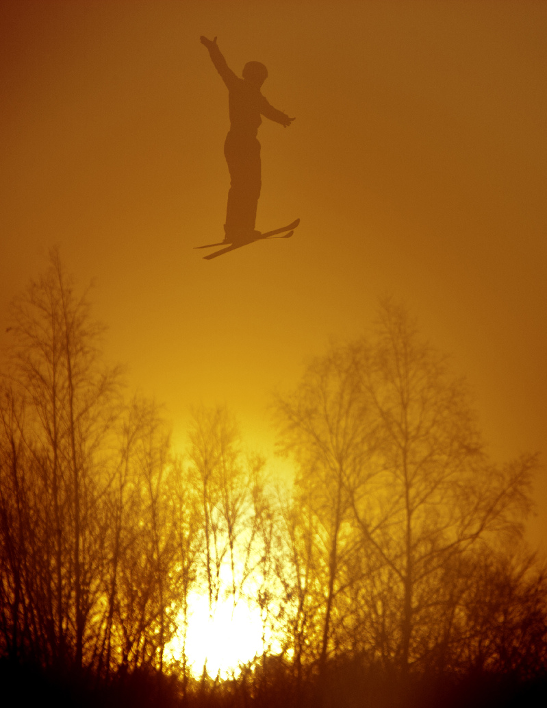 2012年1月10日,抚顺市队的女选手杨雨在赛前训练中。当日,第12届全国冬季运动会的自由式滑雪空中技巧自选动作决赛在吉林市北大壶滑雪场举行。冬日的阳光透过树林照在空中腾跃的运动员身上,仿佛他们的青春在燃烧。(第三届中国新闻摄影年赛体育类新闻组照优秀奖)