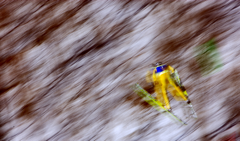 2012年1月8日,吉林市队选手信德涛在第12届全国冬季运动会北欧两项男子个人赛跳台滑雪比赛中角逐。