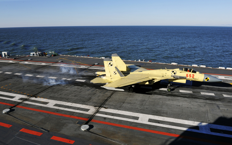 巨大的轰鸣声、强劲的尾流……一股脑儿迎面扑来,我手中的相机以11张/秒高速连拍……歼-15舰载机尾钩钩着阻拦索形成的巨大“V”字凝固在我的相机中。