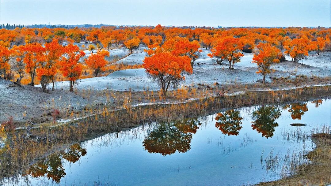 10月24日,新疆阿拉尔市塔河湿地,固定的沙丘、金黄色的胡杨与清澈的水面相映成趣。科普时报记者 季春红摄