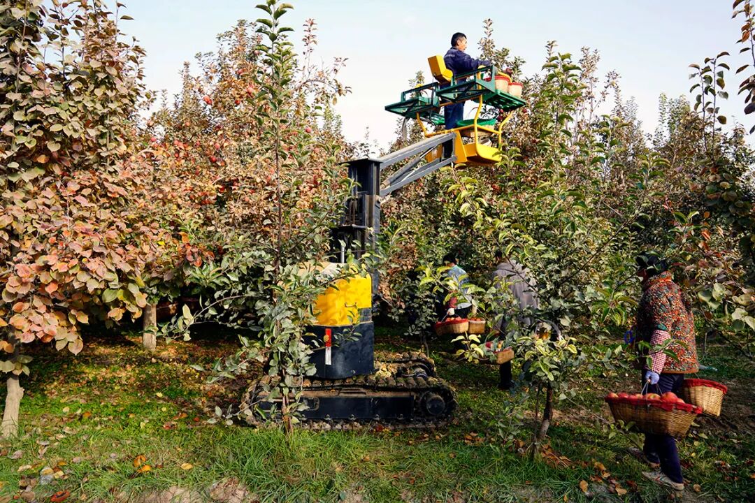 10月23日,第一师阿拉尔市六团双城镇三连职工乘坐采摘机采摘苹果。科普时报记者 季春红摄