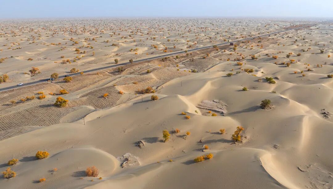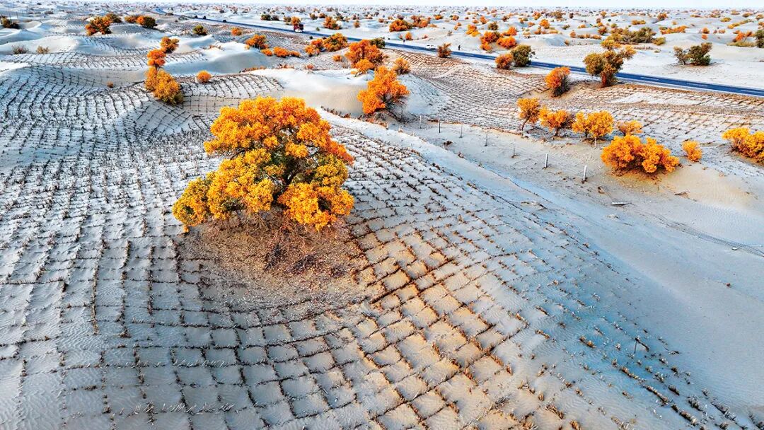 10月23日,塔克拉玛干沙漠,人工草方格与胡杨共同构筑起一道沙漠生态防线。科普时报记者 季春红摄