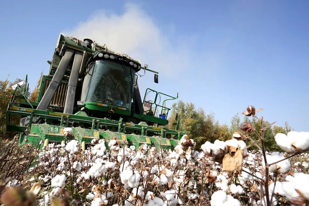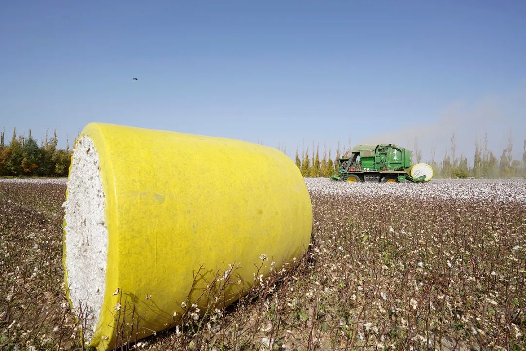 10月25日,第一师阿拉尔市十二团塔南镇十五连的棉花种植基地,大型采棉机一边采收一边将棉花打包成捆。科普时报记者季春红 摄