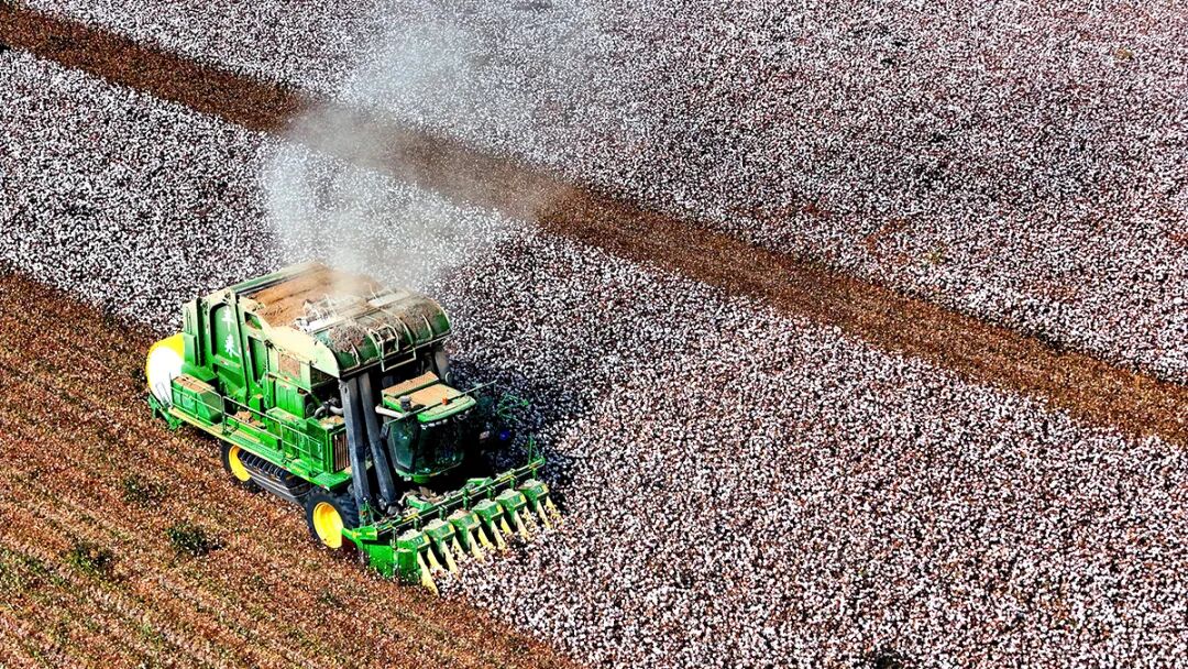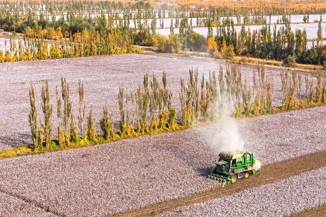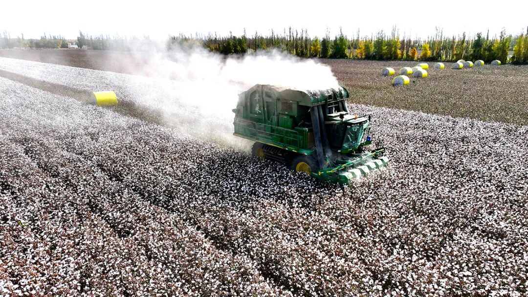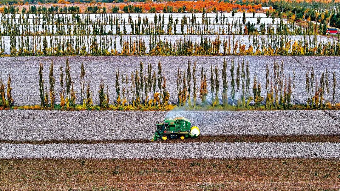 十月的新疆是收获的季节,在兵团一师管辖地,大型机械在收割棉花并打捆待运。赵树宴 摄