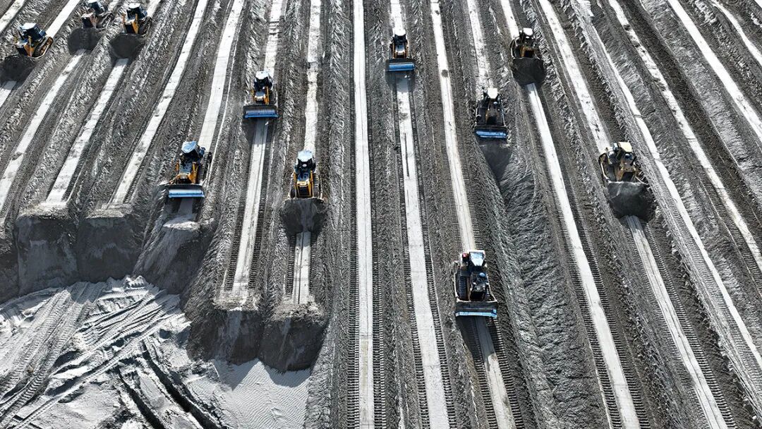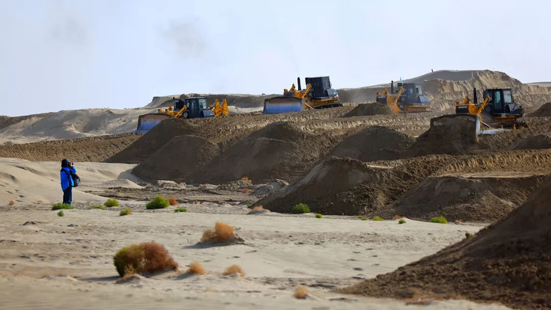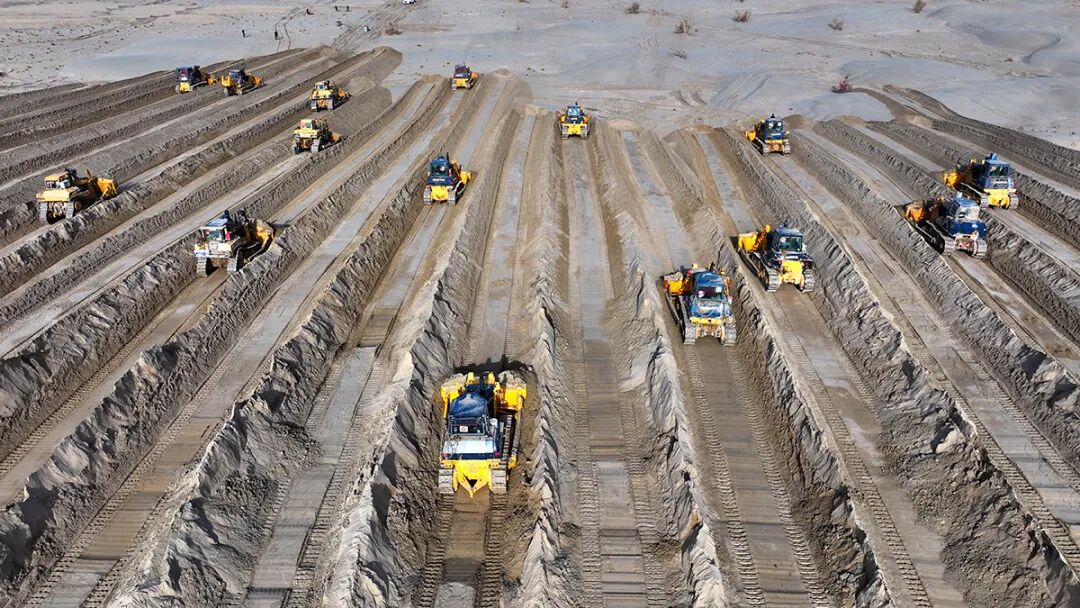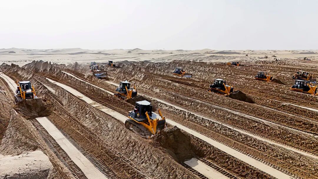 10月24日,第一师阿拉尔市塔里木河干流生态综合治理项目现场,数十台推土机依次排开平整土地。该项目自2021年启动以来,至今累计建设规模已超50万亩。 科普时报记者 季春红 摄