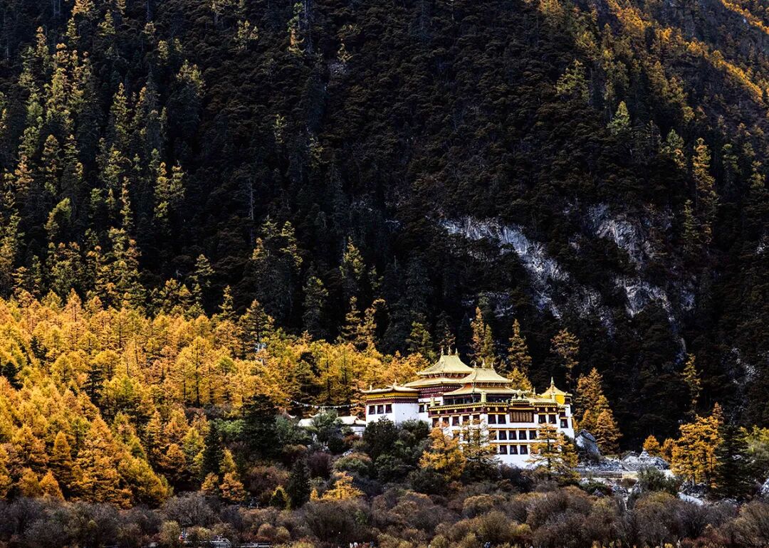 稻城亚丁景区,掩映在彩林中的冲古寺。