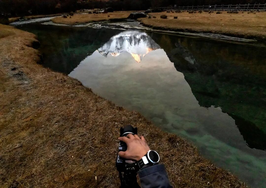 一位摄影师在稻城亚丁景区拍摄日出。