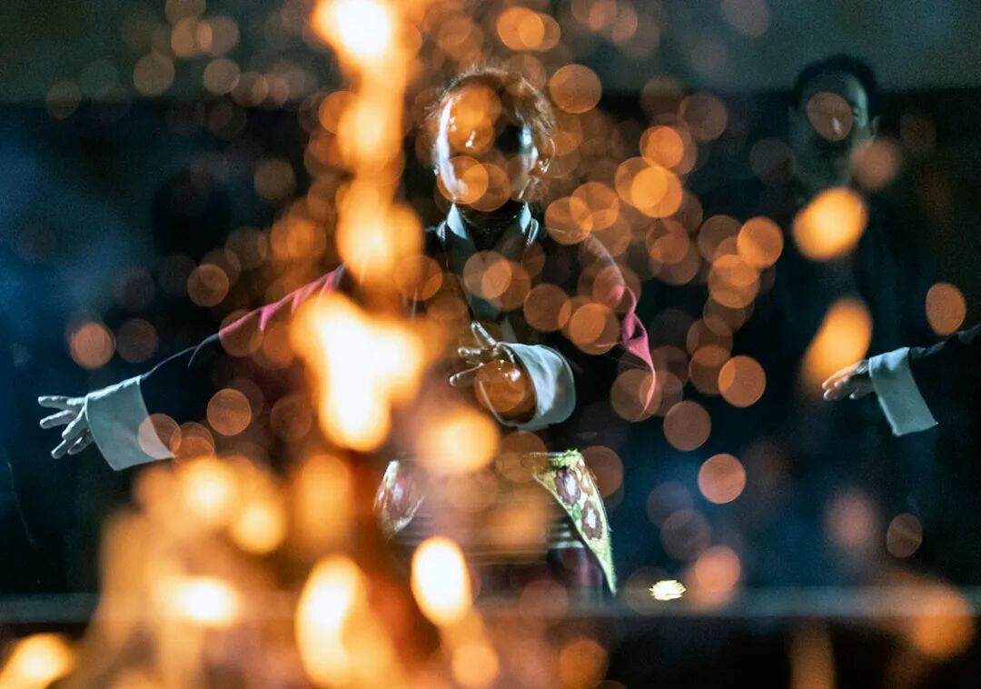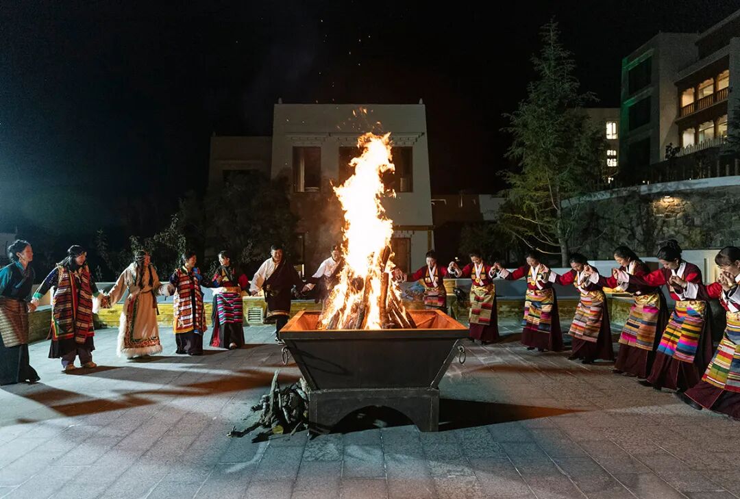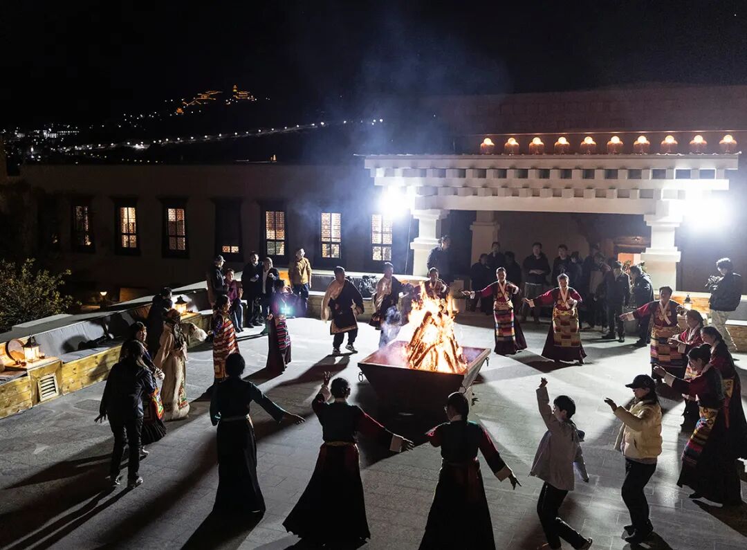 在乡城县博康噶布乡村民宿,身着传统服饰的当地居民围着篝火跳起锅庄舞。