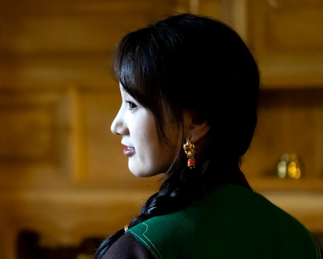 身着当地传统服饰“疯装”的藏族姑娘在乡城县博康噶布乡村民宿里喝酥油茶。