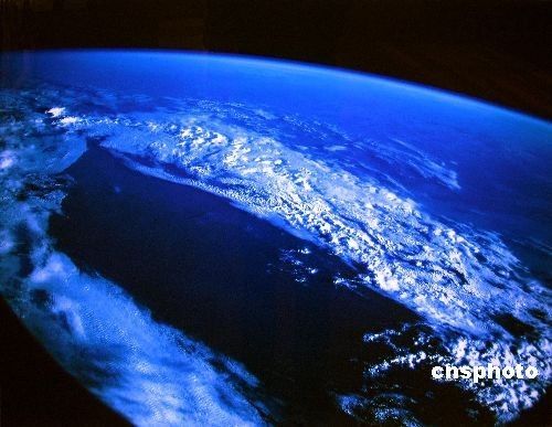 由神舟六号航天员费俊龙亲手拍摄的太空摄影009号作品《地球、冰、云》。