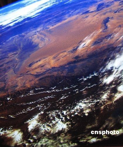 由神舟六号航天员费俊龙亲手拍摄的太空摄影010号作品《地球与沙漠》。