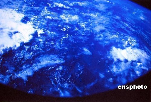 由神舟六号航天员费俊龙亲手拍摄的太空摄影013号作品《地球、云》。
