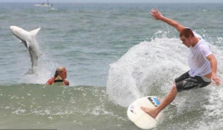 据英国《每日邮报》14日报道,摄影师凯姆·麦克纳尔在美国佛罗里达一处海滩拍摄到鲨鱼在冲浪者周围出没的图片(如图),所幸无人受伤。