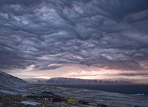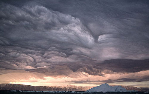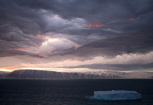 据英国《每日邮报》报道,两位摄影师在格陵兰拍到一组非常壮观的云层照片。乍一看,这些令人难于置信的图片所展现的更像是世界末日的情形而不是冬季日出,这些照片是由英国北极摄影师布赖恩·亚历山大(Bryan Alexander)和切里·亚历山大(Cherry Alexander)在格陵兰西北部地区拍摄的。当看似预告世界末日的云层在英格尔菲尔德湾上空出现时,这两位获奖摄影师正在距北极大约800英里(约合1287公里)的恰纳齐(Qaanaaq)因纽特人居住区。