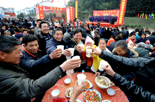2009年1月22日上午,四川省都江堰市向峨乡棋盘村,刚刚搬入新居的1000多名当地群众摆起了“坝坝宴”,大家以这种特别的方式来庆祝乔迁新居和震后的第一个春节。在四川,千人“坝坝宴”只有在重大活动时才举办。这是该乡近30年来首次举办千人“坝坝宴”。