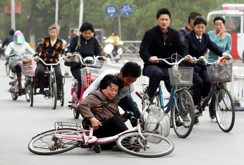 4月15日,在河南许昌建设路上,一位王姓骑车老人被大风吹倒,连人带车摔倒在地。途经此处的当地媒体一名记者跑步上前,急忙搀扶起老人。当日,受北方冷空气东移南下影响,河南省许昌市遭遇大风降温天气,大风使得市民们寸步难行。
