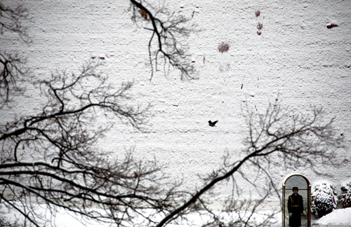 大雪过后,克里姆林宫外银妆素裹,大面积的雪景使得整个画面寒气逼人(图4)。但是,如果没有右下角上挺立的哨兵,整个画面便没有多少阅读价值。我们再设想一下,把哨兵的位置放在画面的中间,或者再放大一些使主体人物清晰起来,那么,你看到的是什么?是的,这只不过是冬日里最平常的景色而已。而将哨兵置于一隅,且画面小得几乎让我们看不到哨兵的脸部,但却使整个画面充满了生气和活力。而且,使整个作品脱离了小品的范畴,产生一种宏大的美。通过画面,我们也许会产生诸多的联想:哨兵背后的克里姆林宫的主人,此刻在忙些什么?冲突不断的俄罗斯联邦,矛盾会不会进一步激化?你也许会思考,作者想通过这样的画面表现什么?