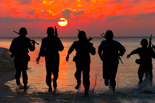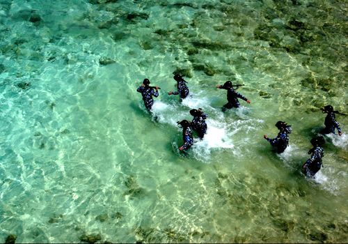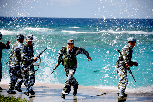 海岛的战士不会放过任何一次与大海亲吻的机会。这处浅滩既是训练的必经之路,也是官兵们的刻意选择——练兵的同时,享受海水的清凉与纯净。