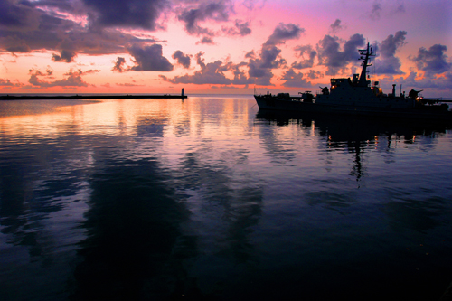 海岛的傍晚总是美不胜收的。如镜水面上的猎潜艇像一位待嫁的新娘,把半个天空给羞红了。