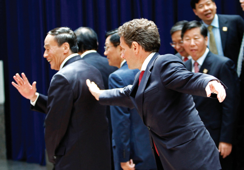2009年7月27日,首轮中美战略与经济对话在美国华盛顿举行。中国国务院副总理王岐山(左)与美国财政部长盖特纳。 摄影 Mark Wilson