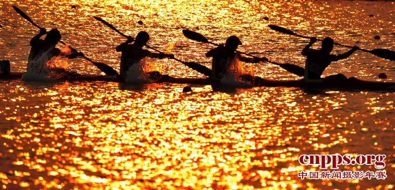 10月23日,夕阳下,南昌队在中国第七届城市运动会男子2000米皮艇比赛中。