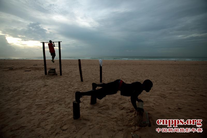 8月20日,足球爱好者在达喀尔海滩踢完球后进行身体训练。