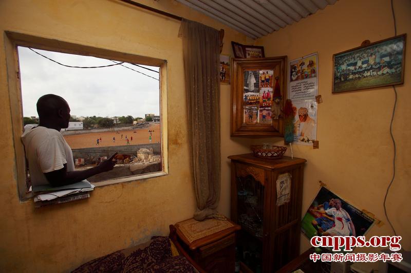 2011年8月18日,足球教练帕尔曼在自己家中阳台上看着弟子们比赛。他曾在沙特联赛效力,墙上挂着他当球员时的照片。