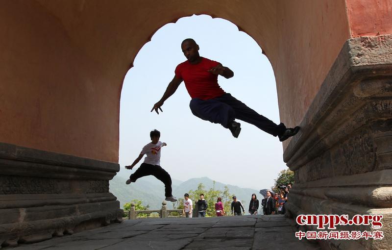 当日,由中国极限运动协会主办的国家级赛事——第二届中国极限跑酷大赛的赛前“TOP跑酷中国训练营”在武当山景区开营。来自国内海选的10名跑酷顶尖高手,与法国元老级跑酷团队“YAMAKASI”及中国武当功夫团的功夫小子们轮番表演,联袂展开了一次侠者与勇者的切磋之旅。此次跑酷走上武当,目的是要打破跑酷运动的国籍界限、城市与自然的界限、传统武术与极限运动的界限,真正将跑酷最本质的力量释放出来。(第二届中国新闻摄影年赛体育类单幅优秀奖)
