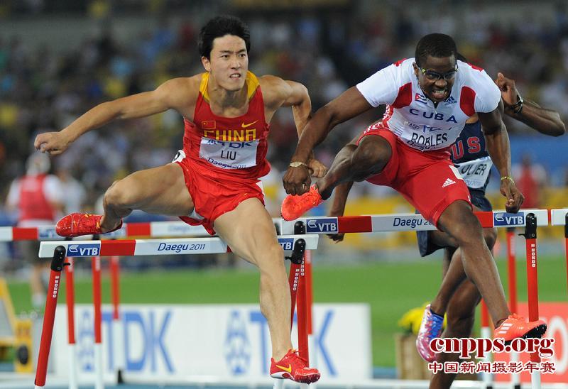 8月29日,中国选手刘翔(左)在决赛中遭遇古巴选手罗伯斯手臂拉拽。当日,在2011世界田径锦标赛男子110米栏决赛中,罗伯斯因犯规被取消成绩,丢掉到手的金牌,刘翔从铜牌晋升银牌。(第二届中国新闻摄影年赛体育类单幅金奖)