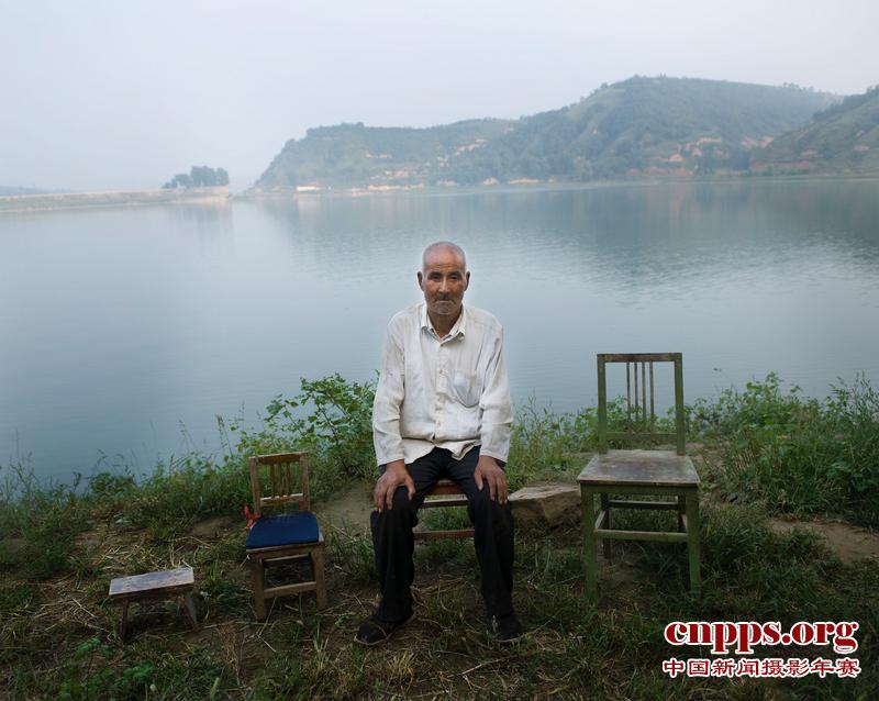 陕西省白水县林皋镇,66岁的焦栓成坐在家附近的湖边(8月27日摄)。焦栓成有3个孩子外出打工。
