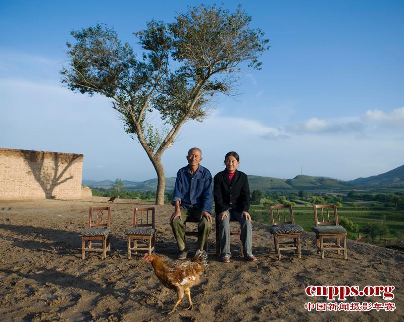 陕西省靖边县席麻湾乡,61岁的王贵贤(左)和老伴张树美在家门前(8月24日摄)。王贵贤有4个孩子离开村子外出打工。
