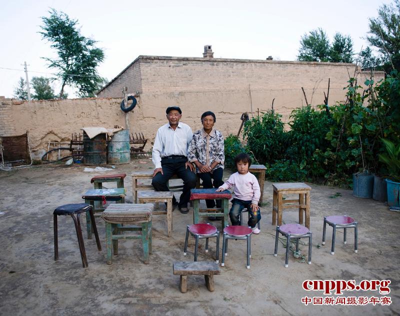 陕西省定边县堆子梁镇,67岁的薛丕忠(左)、老伴杨桂兰和孙子在自己家里(8月23日摄)。薛丕忠家里有十几口人离开农村,外出打工或上学。