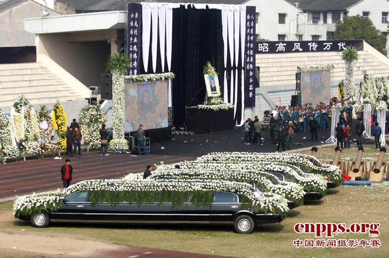 操场上停放着的一排加长林肯和布置的巨型灵堂