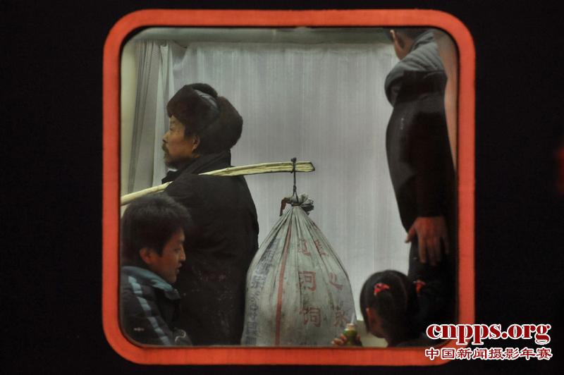 2011年2月1日,在辽宁沈阳,旅客从沈阳北至成都的K388次列车上走过
