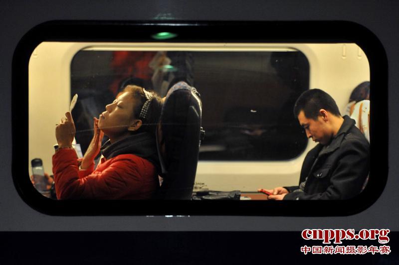 2011年2月8日,在辽宁沈阳,一名女子在沈阳北至长春的D5051次列车上等待发车。