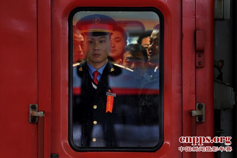 2011年2月8日,在黑龙江省长春市,一名工作人员在长春至西安的K128次列车上等待停车。