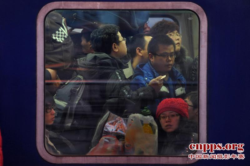 2011年2月11日,在辽宁沈阳,旅客从沈阳北至深圳的T188次列车上走过。