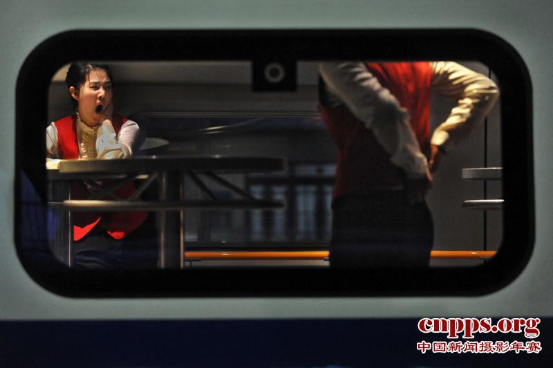 2011年2月1日,在辽宁沈阳,列车员在沈阳北至北京的D18次列车上等待开车。