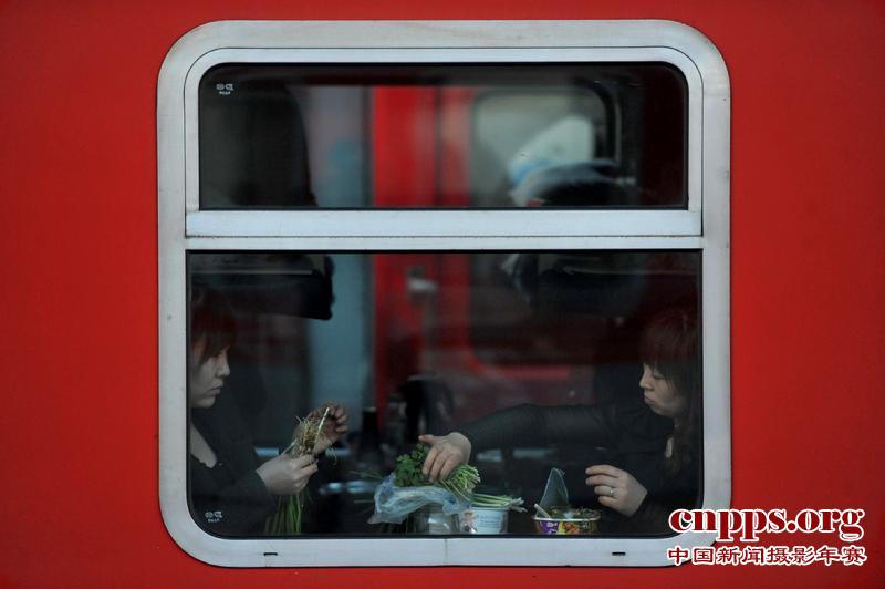 2011年2月8日,在黑龙江省哈尔滨,旅客在1174次列车哈尔滨至太原的火车上择菜。