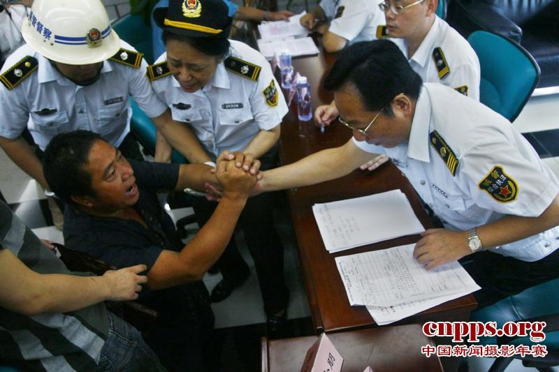 2011年8月11日上午,在广州市城管委的接访现场,来自广州市白云区太和镇营溪村的村民林健晃情绪激动,跪在广州市城管执法局书记陈小鹏面前,大喊“希望陈包公能给我们解决问题”,林健晃投诉多年的有关“非法占用农耕地”的问题至今未予以解决。当日,来自广州市12个区和19个市直部门的1107名领导干部同时接访,共接待来访群众7522人次。(第二届中国新闻摄影年赛日常生活类单幅优秀奖)