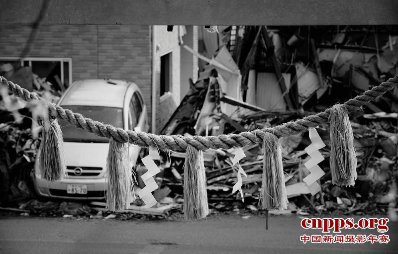 日本岩手县大船渡町。一处神社的传统饰物在海啸中幸免,而不远处则是一片疮痍。