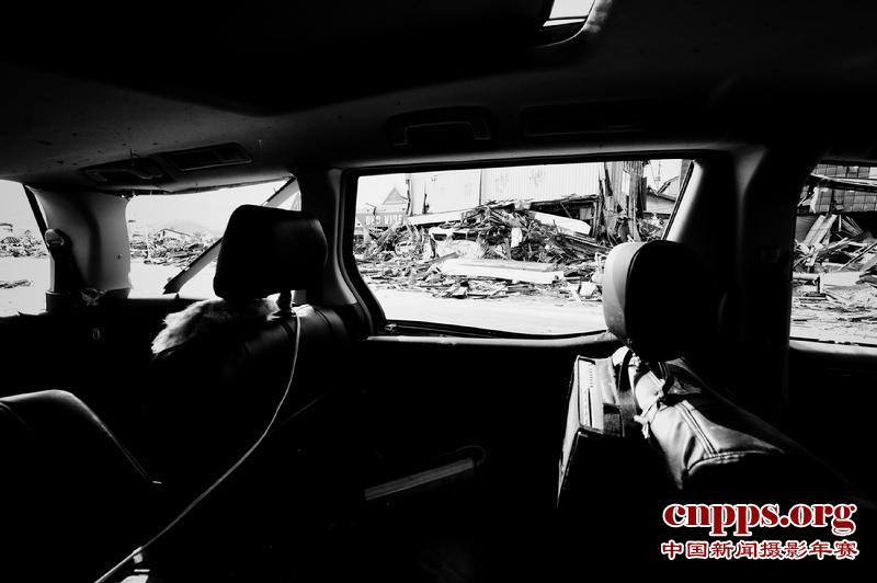 日本岩手县大船渡町。从一辆汽车的残骸中窥望地震和海啸对当地造成的毁灭性打击。
